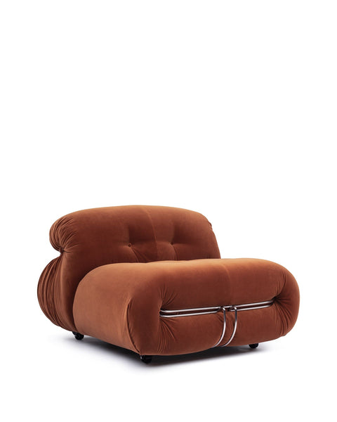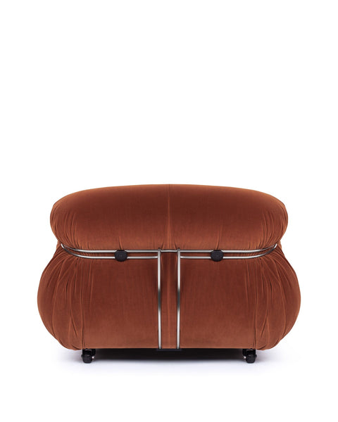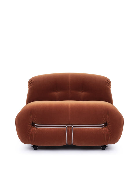 The relaxed and informal design approach of the Soriana collection reflects the 1970s' emphasis on creating comfortable and inviting living spaces. This period witnessed a shift towards more casual and accessible interiors, encouraging a sense of freedom and self-expression within the home. Defined by its voluminous curves and clamp-like exoskeleton, the Soriana’s generous upholstery wraps around its rounded form, finished with buttoning on the seat and backrest for a subtle quilted effect. Explore the full collection for matching pieces.