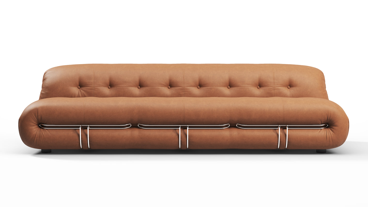 The relaxed and informal design approach of the Soriana collection reflects the 1970s' emphasis on creating comfortable and inviting living spaces. This period witnessed a shift towards more casual and accessible interiors, encouraging a sense of freedom and self-expression within the home. Defined by its voluminous curves and clamp-like exoskeleton, the Soriana’s generous upholstery wraps around its rounded form, finished with buttoning on the seat and backrest for a subtle quilted effect. Explore the full collection for matching pieces.
