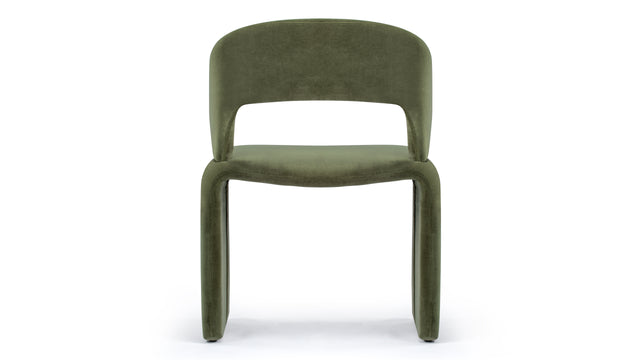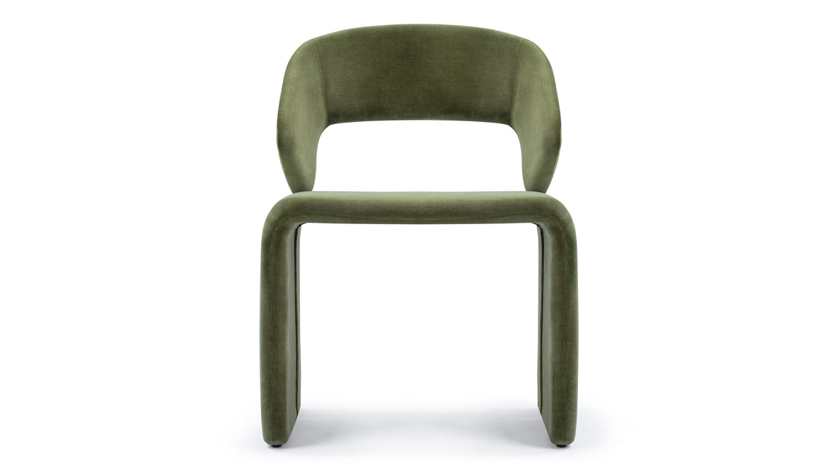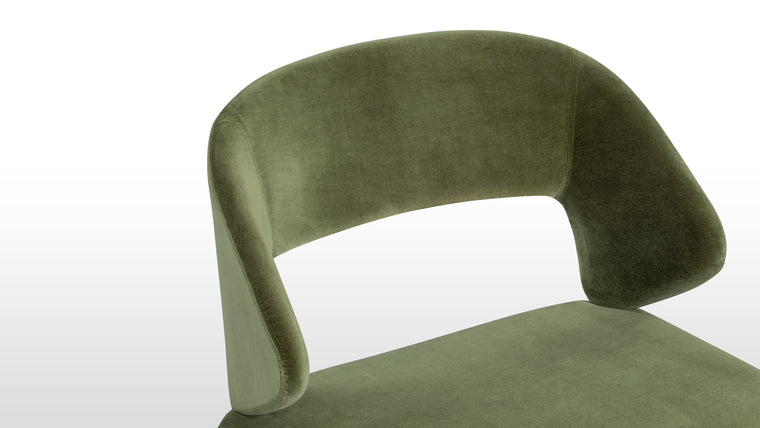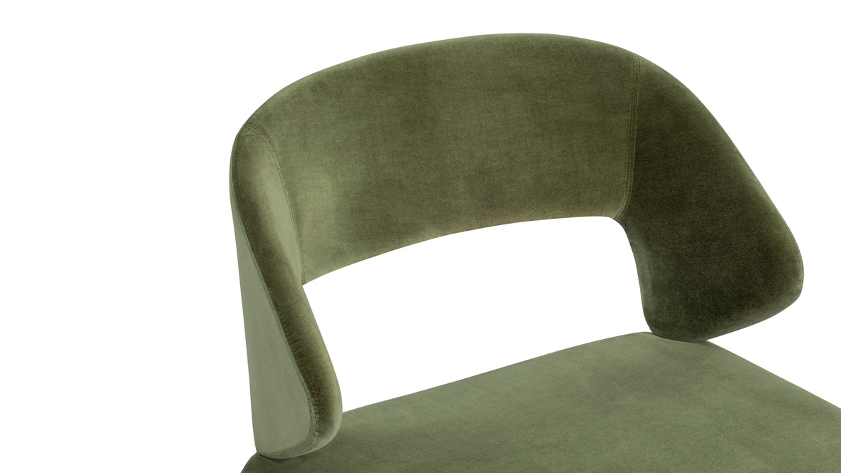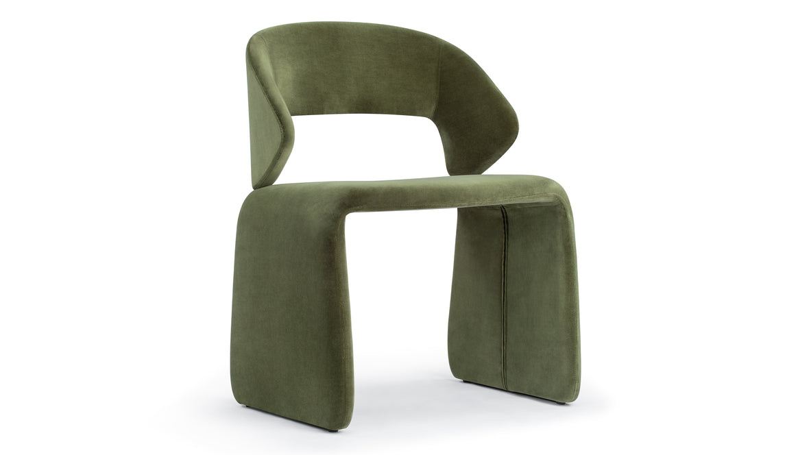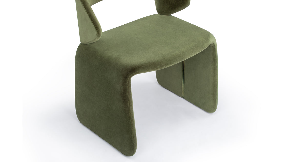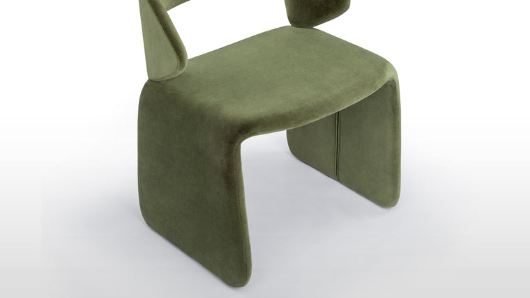 The Suit Chair merges modern sculptural design with ergonomic functionality, featuring a seamless frame upholstered in velvet. Available in Olive Green and Burnt Orange, it offers both visual appeal and lasting comfort for any room.