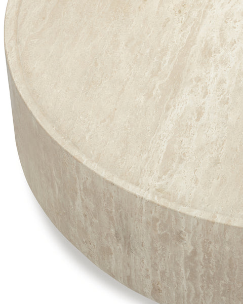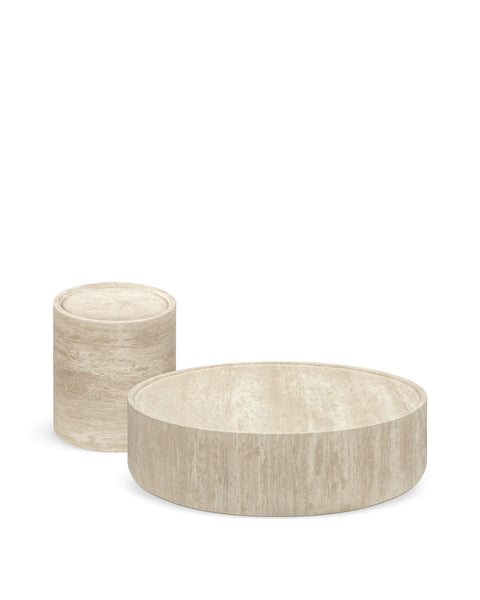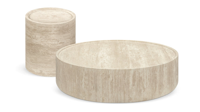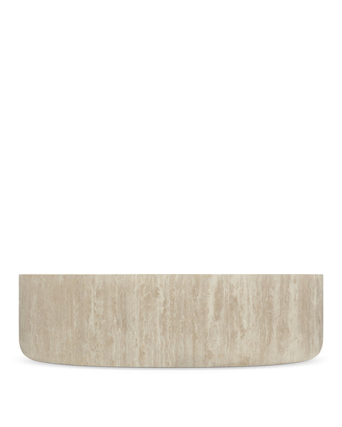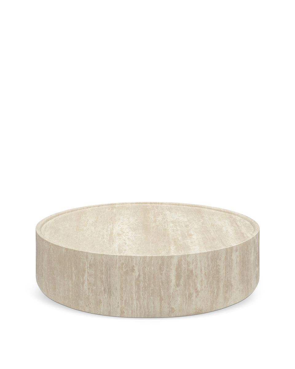 Crafted from exquisite travertine, the Toren Coffee Table showcases its signature veining, evoking cloud-like patterns across its honed surface. A recessed lip adds both functionality and a touch of style, containing items while enhancing its sleek aesthetic. With a robust pillar design, this versatile piece is available as a low coffee table or a taller side table, blending practicality with timeless elegance.