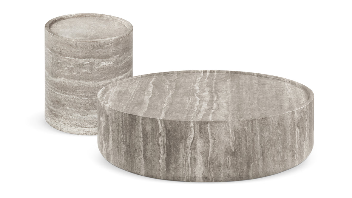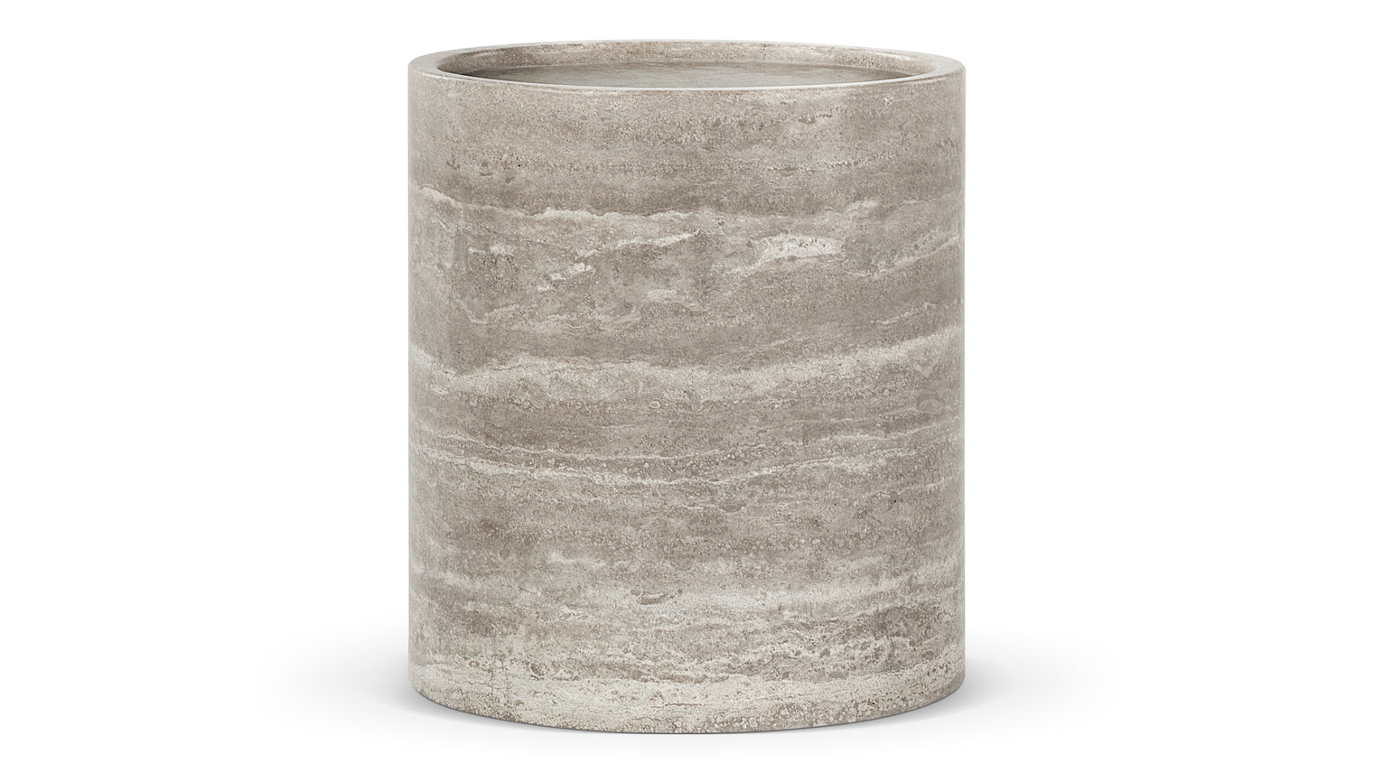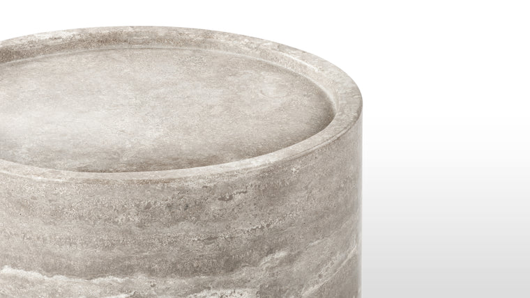 The Toren Side Table combines natural travertine beauty with practical design. Featuring a honed surface with unique veining and a recessed lip, it is available in both a low and high style, offering timeless versatility for modern living spaces.