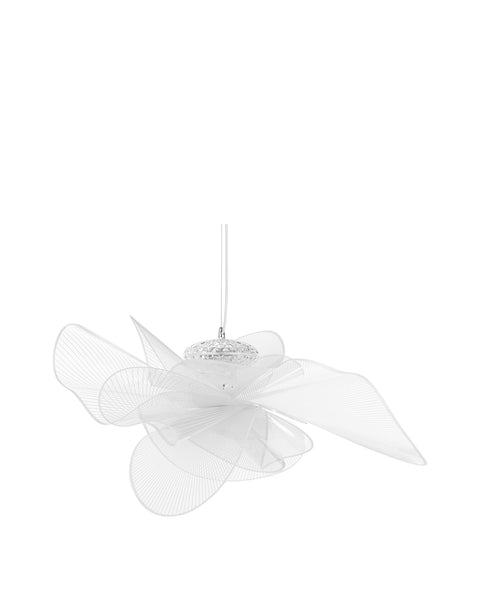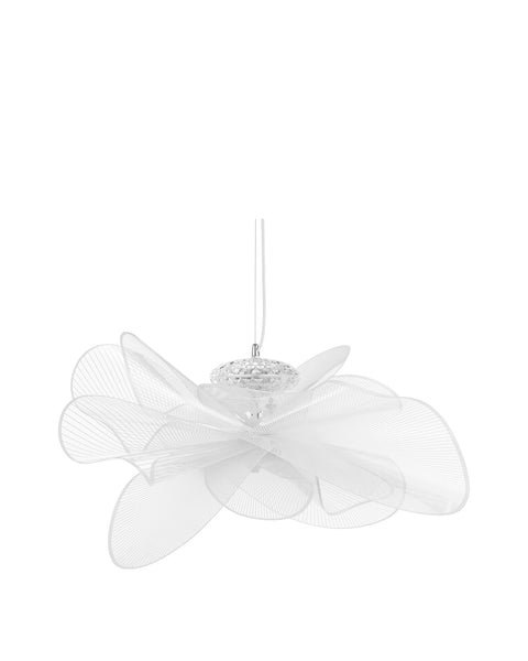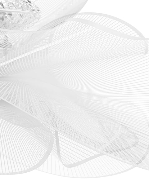 The Tulle Ceiling Lamp is a contemporary fixture featuring wide, curving acrylic pieces that resemble undulating waves. The LED system is situated inside a compartment with a crystal-like design, casting a warm white light that enhances the ambiance of any room. The light’s design is reminiscent of the texture and light diffusion properties of tulle fabric, which combined with a thin cord, grants an incredibly lightweight appearance.