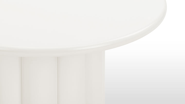 The circular shape and rounded edges of the table ensure functionality with a contemporary aesthetic. A smooth finish adds a soft, organic touch to the overall design.