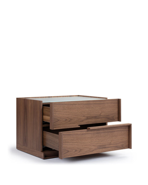 The Vienna Nightstand seamlessly blends modern minimalism with functional elegance. Featuring straight, clean lines and a sturdy design, this walnut veneer nightstand showcases a beautiful natural grain pattern. Its two spacious drawers are enhanced with seamless, integrated handles, maintaining the unit’s sleek aesthetic. The recessed white panel adds a contemporary touch, while the geometric step pattern created by the drawer divisions adds visual interest.